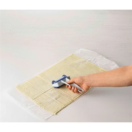 Les 2 roulettes pour confectionner des amuses-bouches carrés permettent d’obtenir une dizaine de carrés par plaque. La roulette découpe des rectangles que vous garnissez sur l’endroit plein et vous rabattez le dessus en collant les côtés pour les souder. Vous obtenez des amuses bouches striés ou des amuses bouches étoilés que vous pouvez garnir de sauce tomate, tapenade, fromage ou de préparations sucrées (compote, confiture, chocolat…).